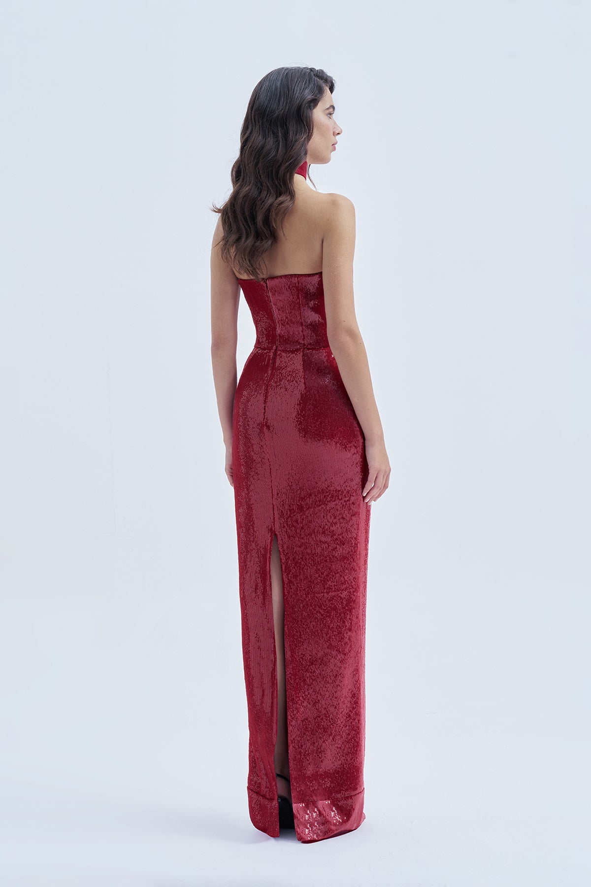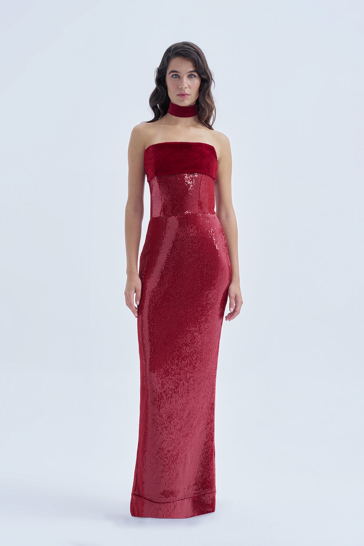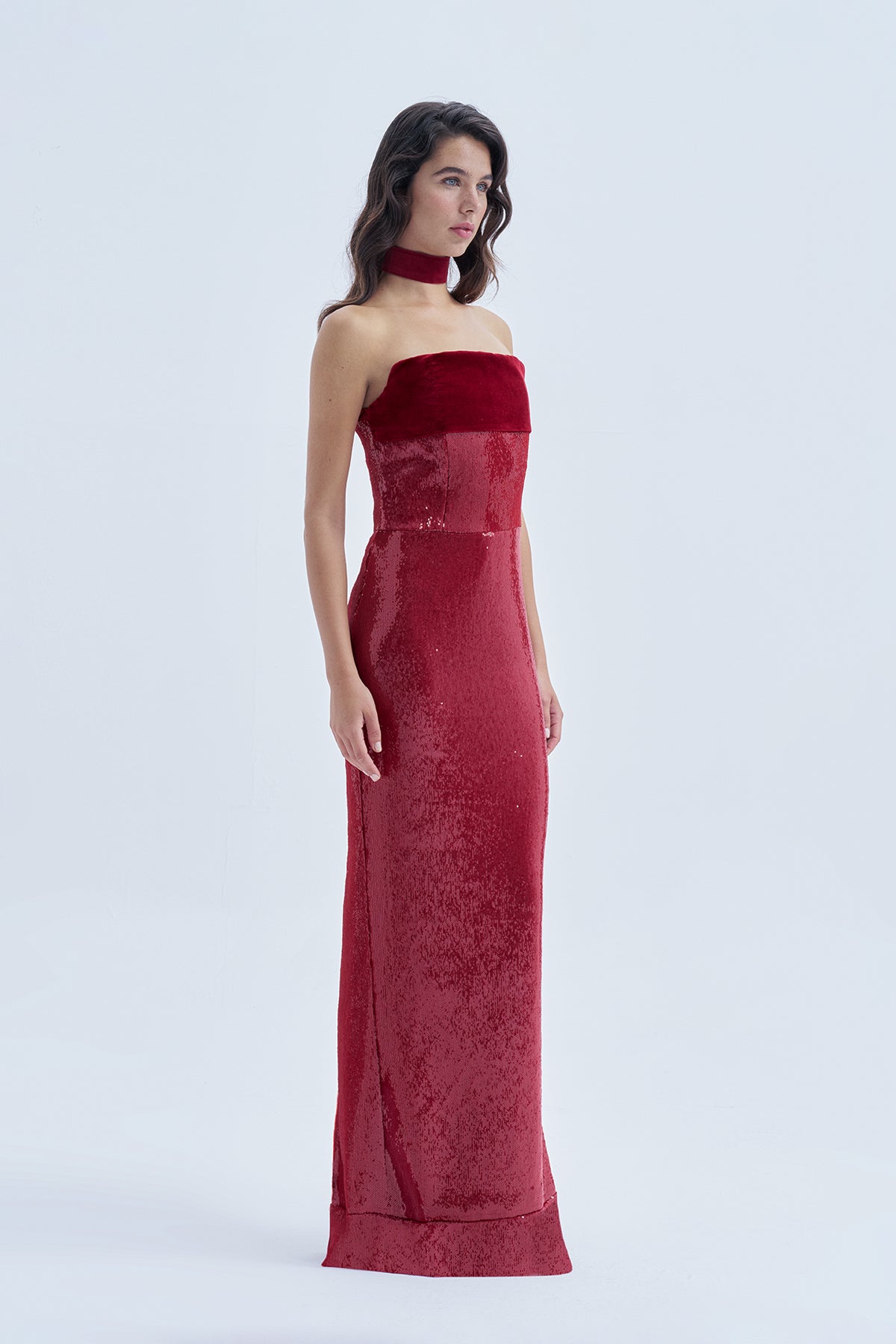 Yakut Kırmızısı Payetli, Korsajlı, Dekoltede Kadife Detaylı Uzun Abiye Elbise