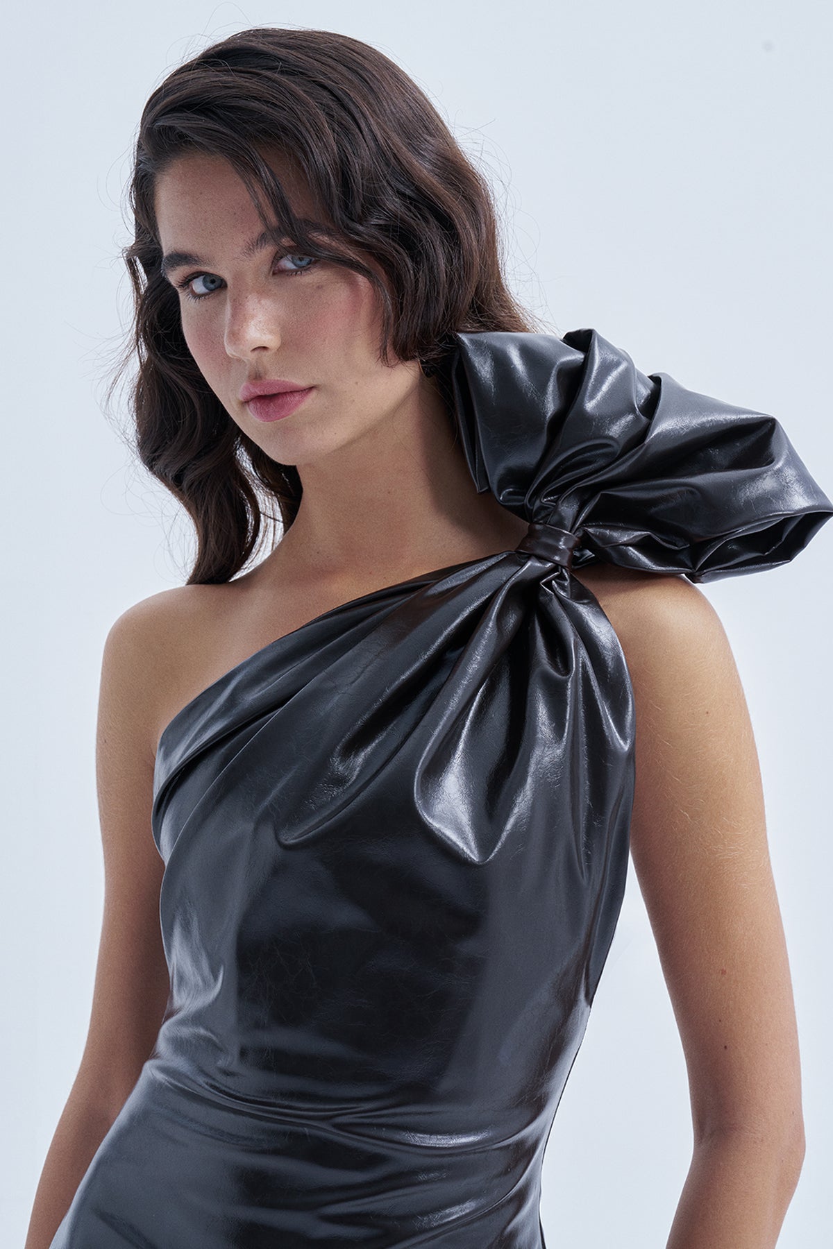 Kahverengi Deri, Tek Omuzda Büzgülü Bağlama Görünümlü Mini Elbise
