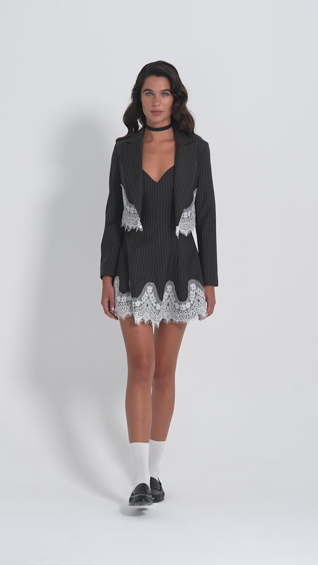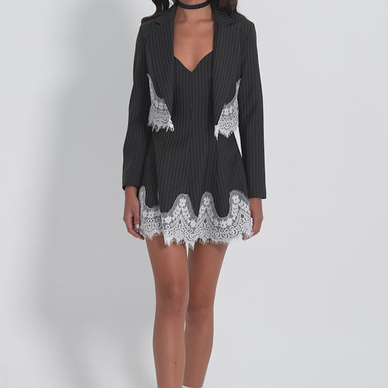 Siyah İnce Çizgili, Evaze Etekli, Beyaz Dantel Bitimli Mini Elbise