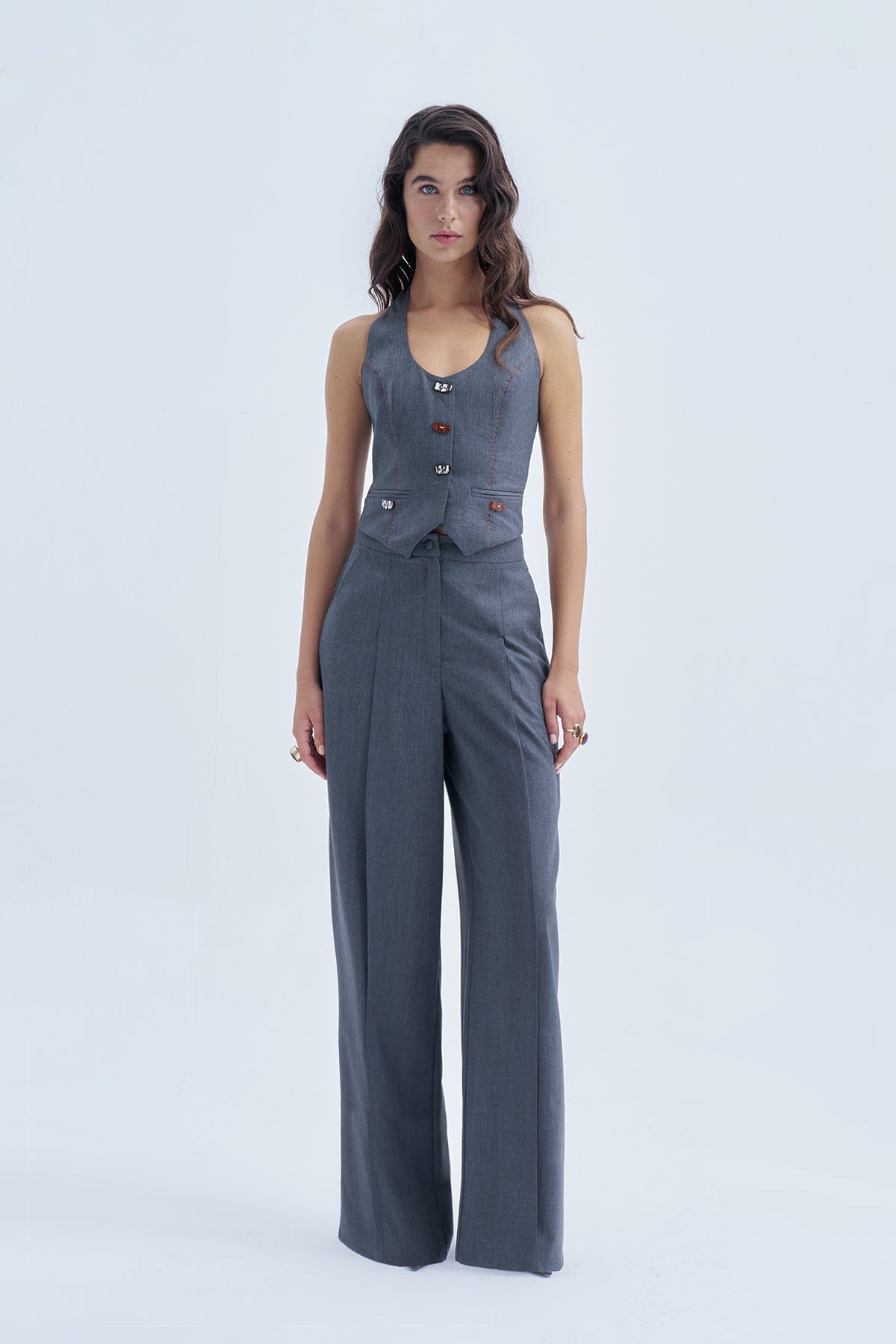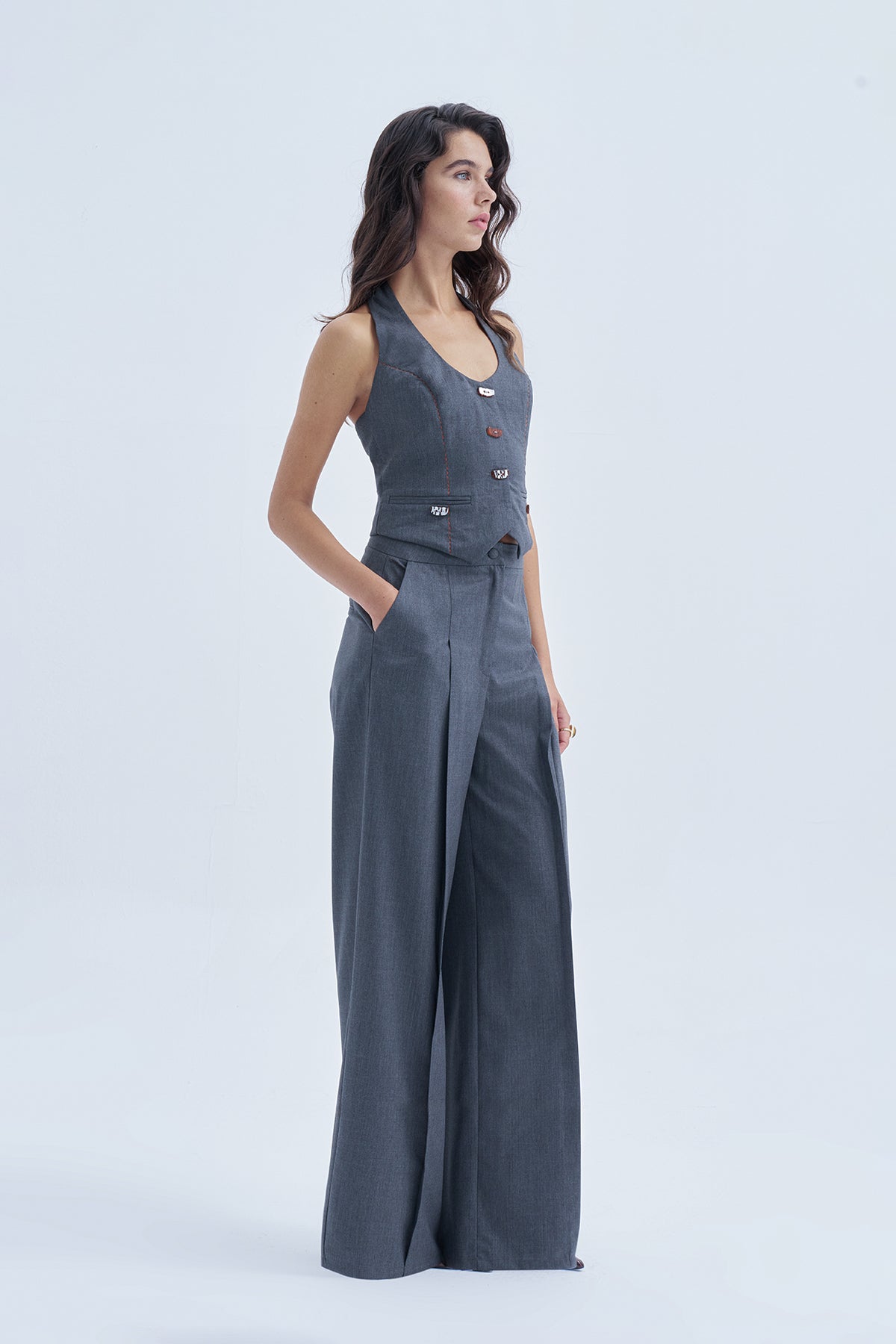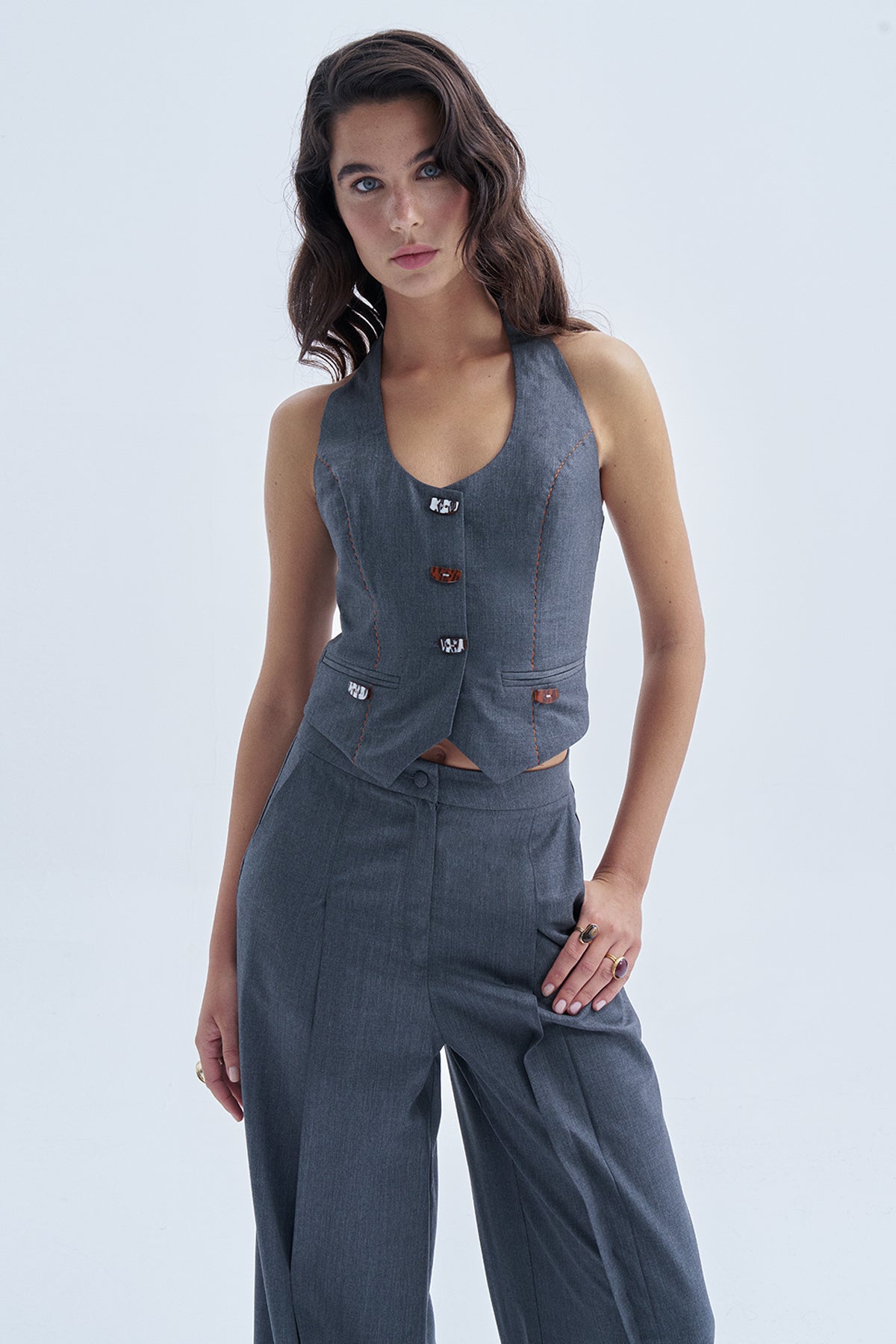 Gri Asimetrik Kesim, Kemik Düğmeli, Boyundan ve Arkadan Bağlamalı, El İşi İplik Dikişli Yelek