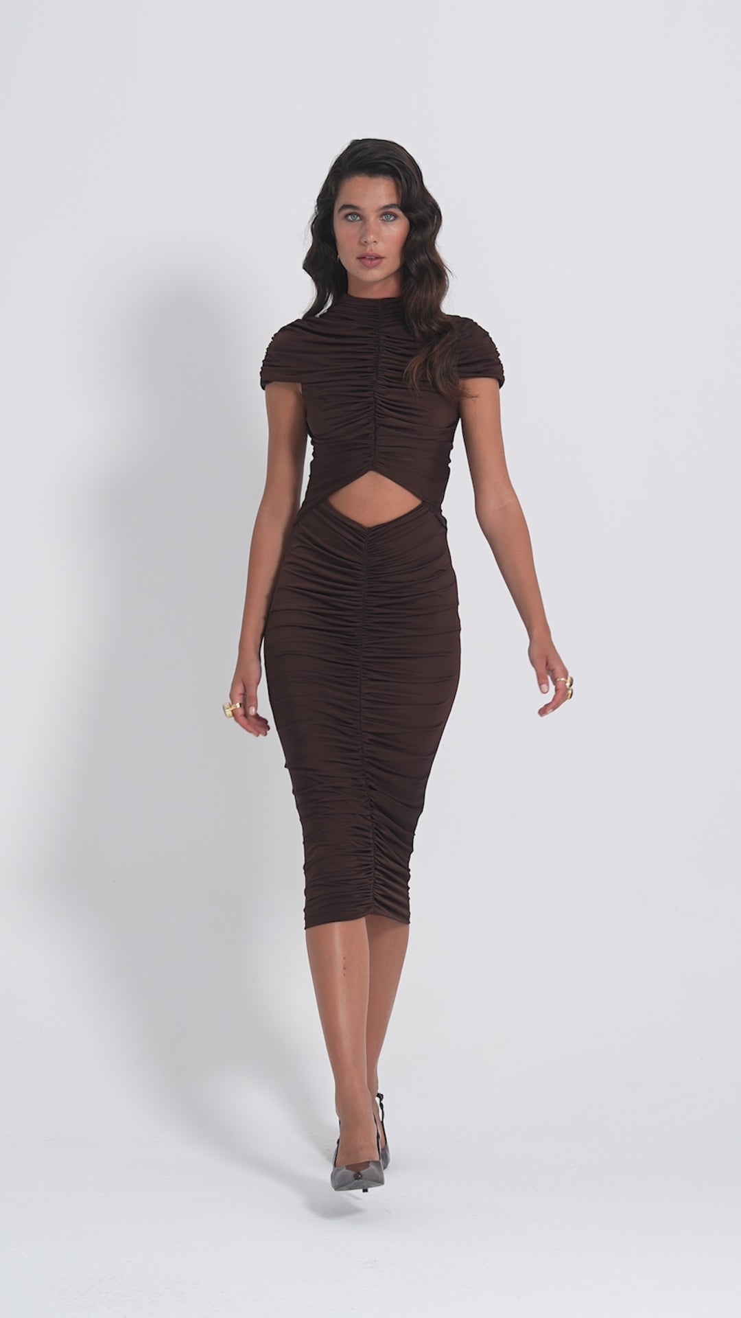 Kahverengi Streç Kumaş, Ortadan Büzgülü, Cut-Out Detaylı, Midi Boy Elbise