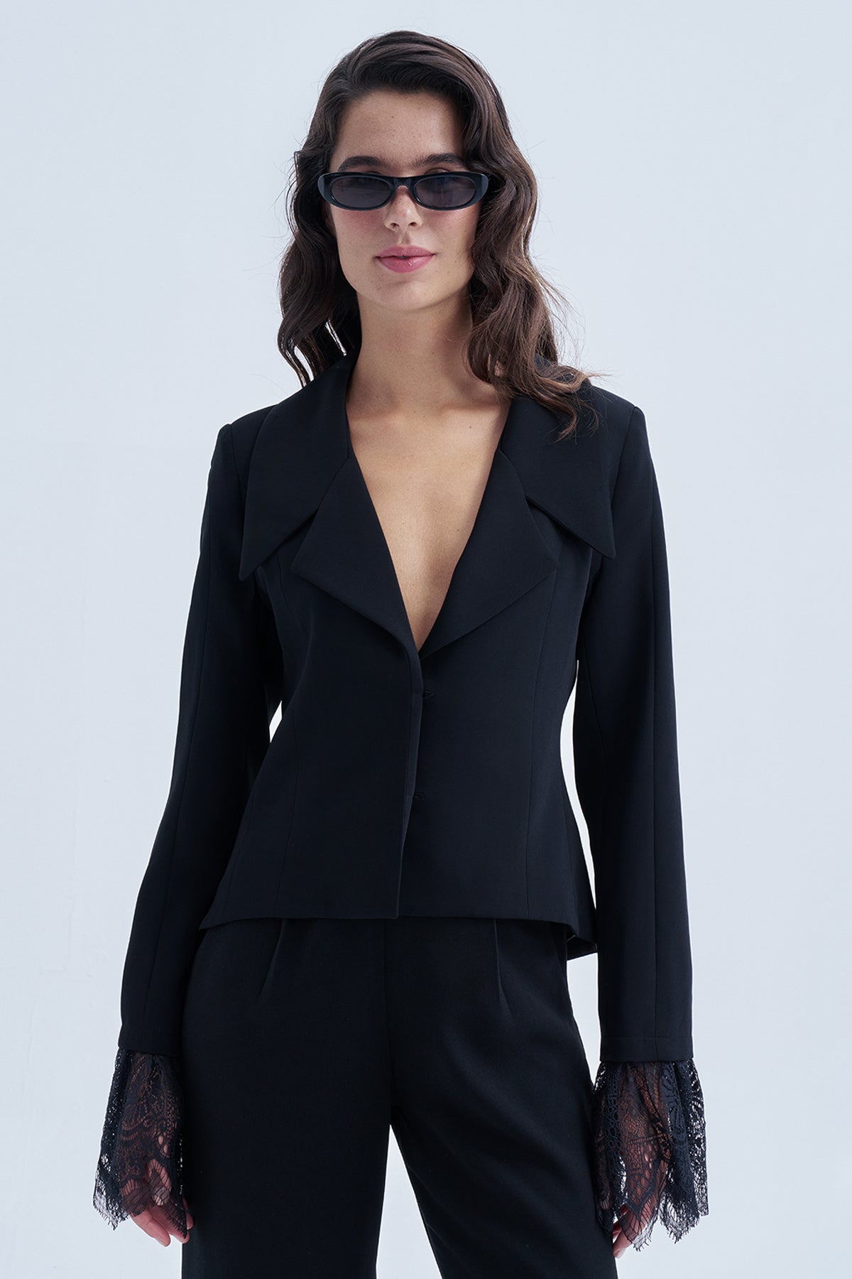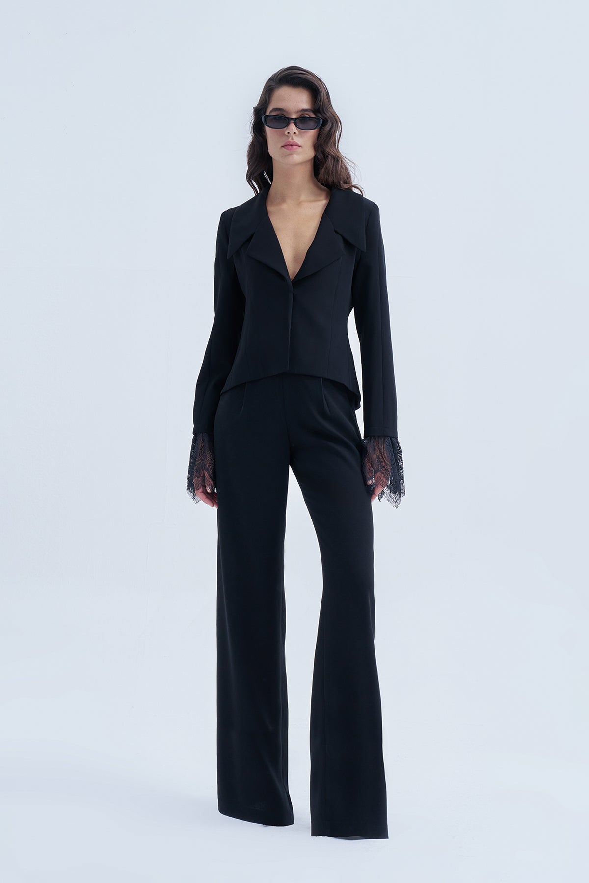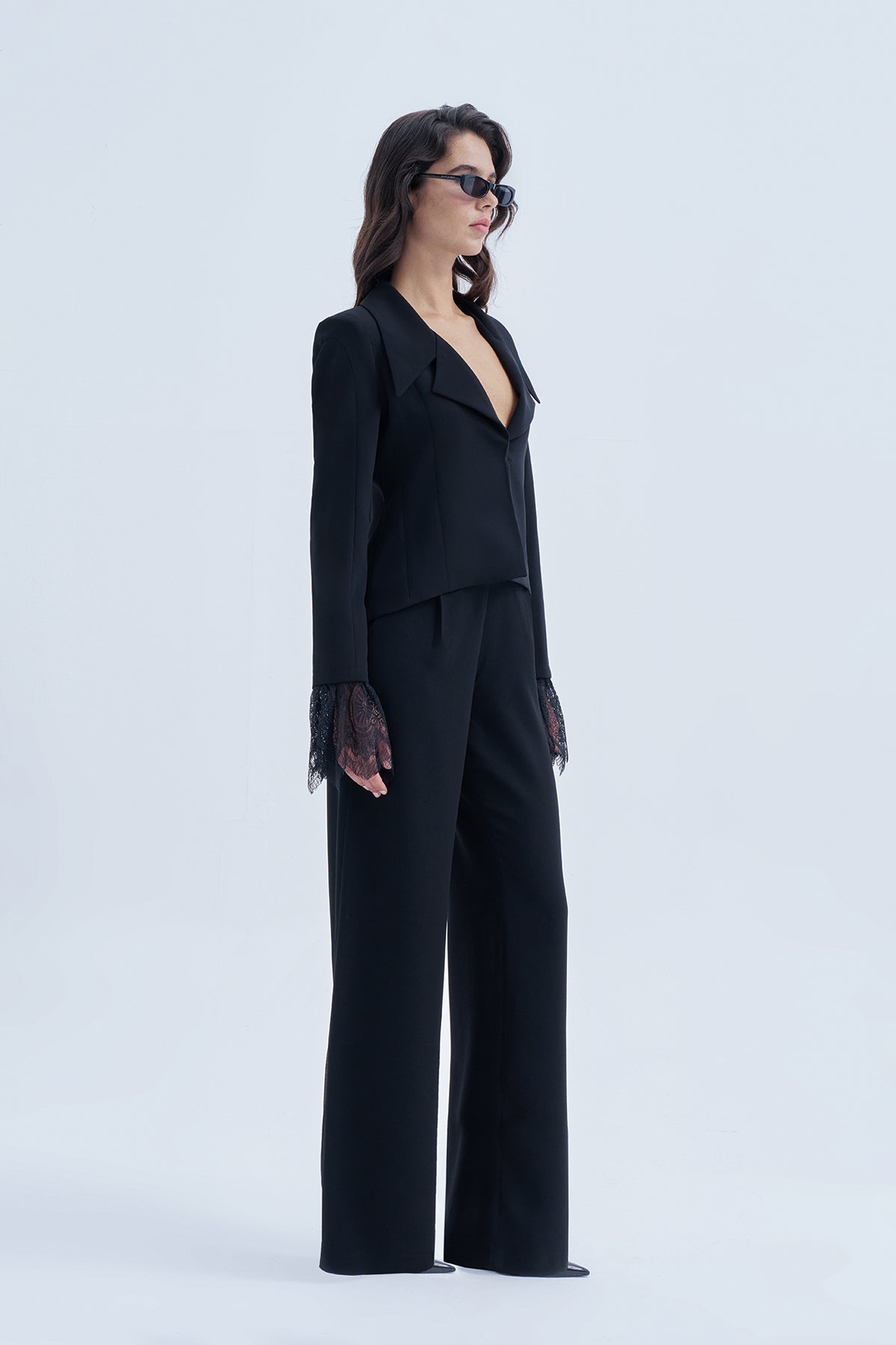 Siyah , Yüksek Bel, Pile Detaylı, Geniş Paça Pantolon