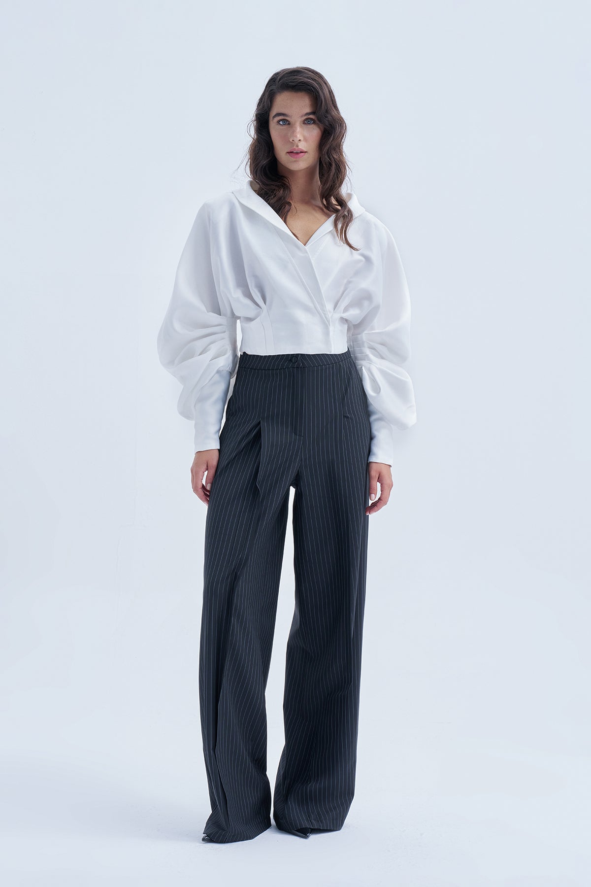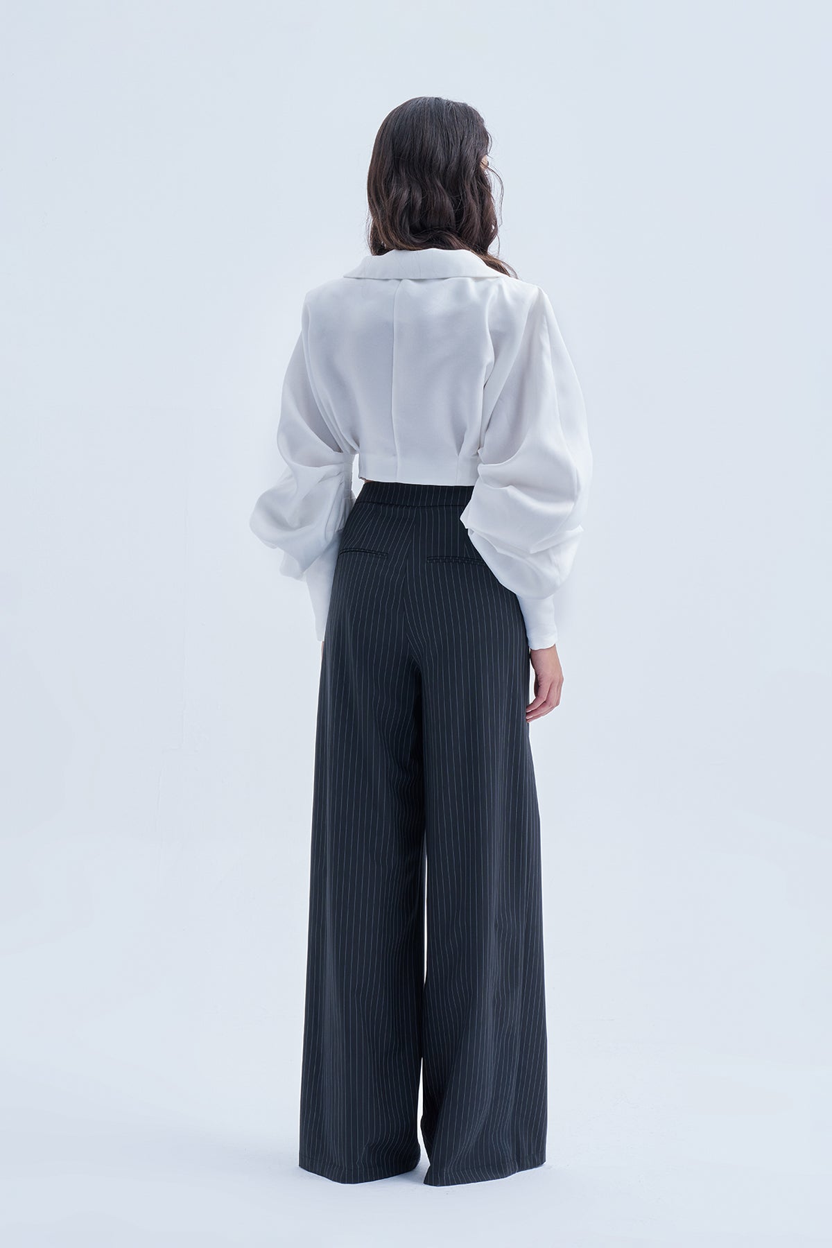 Beyaz Kruvaze Kapamalı, Balon Kol Kesimli, Manşette Pile Detaylı Ceket