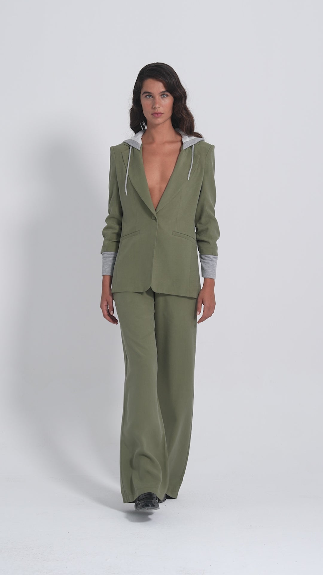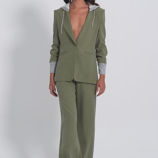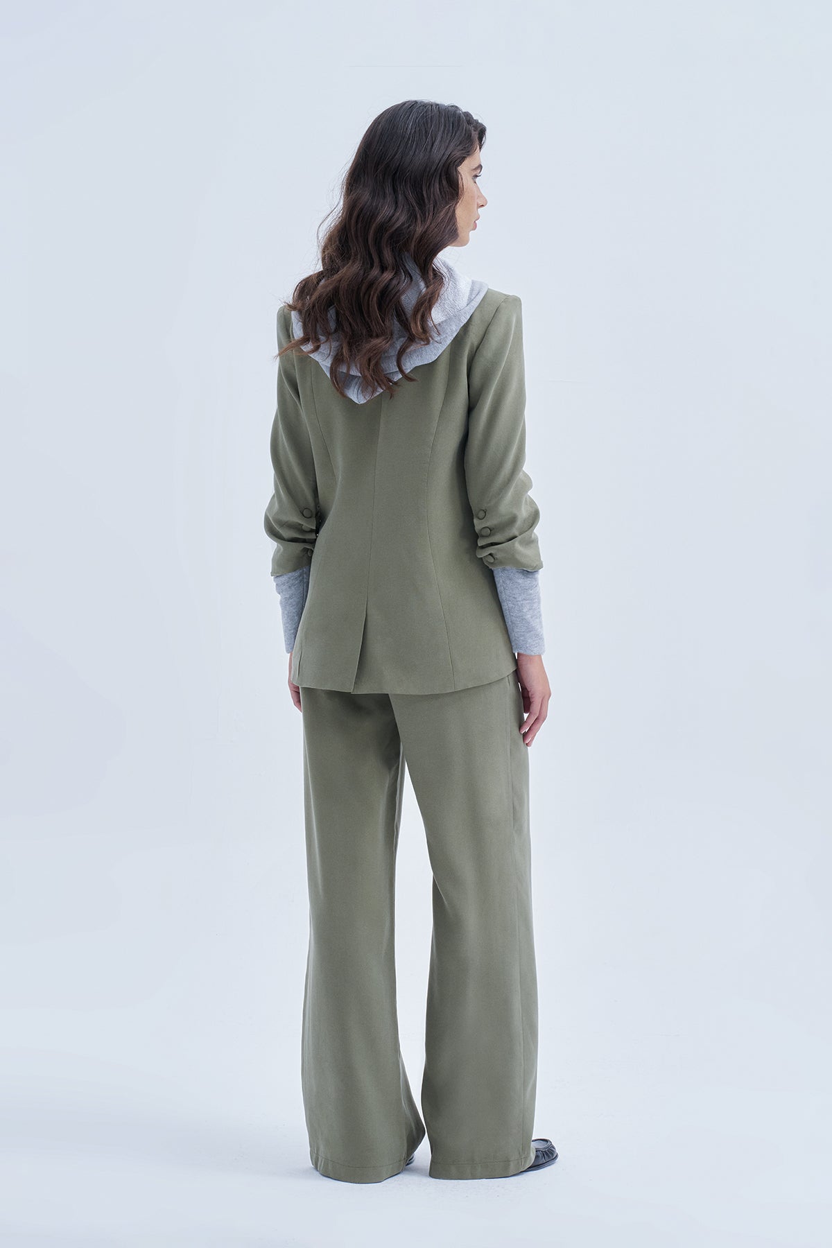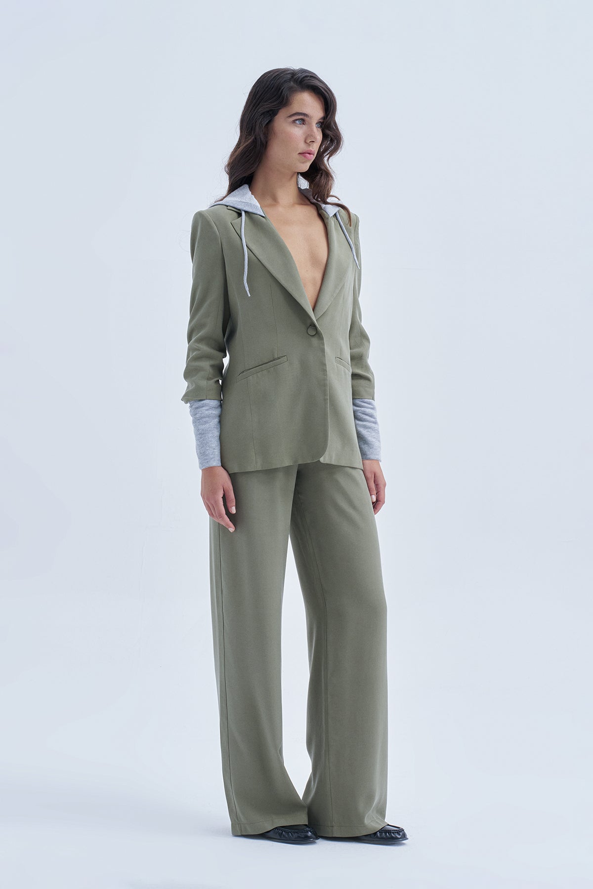 Haki Renk, Gri Örme Kapüşon ve Kol Ribana Detaylı, Relaxed Fit Ceket