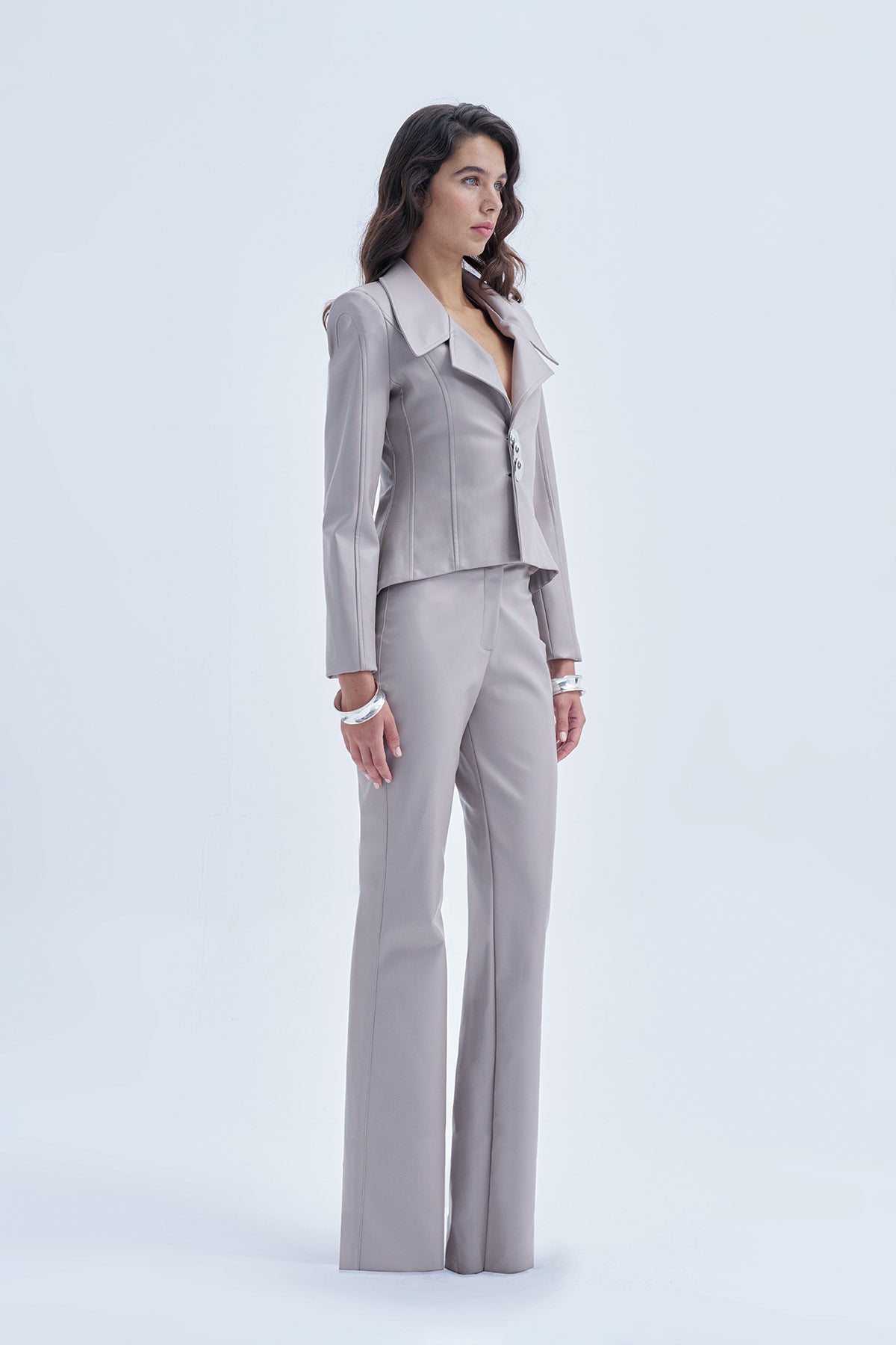 Vizon Suni Deri Üzeri Silver Düğme Detaylı, Fitted Kesim Ceket